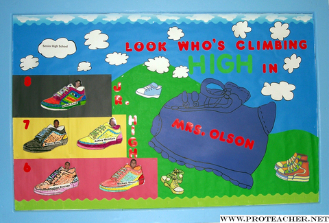 ![]() From the beginning, I wished to help my students feel at home in the classroom and to reassure them that their contributions would be valued. I also wanted them to feel involved. I had seen the idea of each student personalizing a paper sneaker before. Next, I thought about the three grades and about how each student was at his/her own level of climbing the mountain of success. The largest cloud is labeled Senior High. I found a sneaker pattern and the smaller sneakers at a free clip art site. A fellow teacher from Mississippi supplied the pattern for the largest sneaker. I cut out the mountain and clouds freehanded. I chose the three stair steps to represent each grade. The board was waiting for the students when they arrived the first day of school, with their names sticking out of unfinished sneakers. I took digital photographs of each child and made copies. Each student decorated his or her own shoe and put these on the board with their "faces" peeking out of each shoe. The parents and the students seemed to like the board a good deal. My principal was pleased.