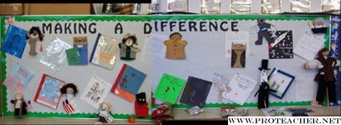 ![]() This bulletin board title stayed up for two months in my classroom. Along with the usual study of George Washington and Abraham Lincoln in February, my third grade students researched people who made a difference. Some examples, as you can see here, were Columbus, Betsy Ross, Neil Armstrong, George Washington, and Michael Jordan. Students wrote a report, made a puppet, and gave a presentation. We learned a lot about individuals from all walks of life in a few weeks. The final products were displayed on this bulletin board. In early March, I sent home the reports and puppets from the bulletin board. I kept the title and the white background. I then took digital pictures of my students in front of the board with the title over their head. I posted their pictures on the bulletin board under the title. The students then wrote a short story on how they want to make a difference in their classroom, in their community, and in their world. Those ideas were then posted on the bulletin board under each of their pictures. It was a great follow-up to the "famous person" making a difference idea. I know that my students will make a difference in our world!