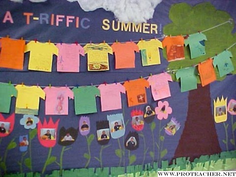 ![]() Students love telling about their summer, so this gave them a creative way to do it! They were each given a construction paper shirt to draw and write about their summer. They were also given a piece of construction paper to create and cut out a flower for the bottom of the board. I put blue bulletin board up, painted a tree on each side, painted plant stems/leaves at the bottom, made grass at the bottom by shredding green bulletin board paper, and made cotton clouds at the top. We put string between the painted trees (hot glued at each end) and they hung their t-shirts with little colored clothes pins. I took their pictures with a digital camera and they glued them to their flowers. Parents were thrilled to see these at Open House! I even used the t-shirts and flowers later by laminating them and adding them to the child's personal scrapbook (to be given to parents the last week of school).