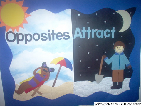![]() This board was done to go along with a theme I did on Seasons. I took the opportunity to teach the children about opposites as well as. I used blue construction paper to make a border. I drew the young girl and the old man, the sun and the moon, and the props and had them laminated. For the sand I used manila colored paper and glued real sand on it and for the snow I glued batting on white paper, this allowed the children to feel the "opposites." For the background I used wallpaper. I used die-cut letters for the title. The children learned many opposites from this board; they learned day/night, young/old, rough/soft, balck/white, and the types of clothes you wear for different types of weather. They enjoyed touching and discussing the difference between the "snow" and the sand.
