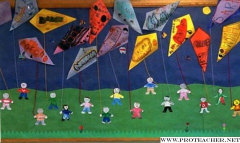 ![]() Here is a way to brighten up your room for spring. First, cut different colors of construction paper into 12" X 12" squares. Let children choose a color, then have them fold 2 corners in (to the midline) to make a diamond shape. (This will give you flaps on the back to staple to the board, making the kite look 3D.) Next, have the student write their first name in large letters on the front of the kite. They can then decorate by outlining in various colors around the letters, or decorate each letter individually. Next, have them draw a simple body shape on another piece of paper (or use a pattern to control the size), and tell them to make the body look like themselves: hair color, clothes they are wearing, etc. Cut out the body and put it with their kite. To assemble the board, cover it first with blue paper, then put a strip of green at the bottom of the board to look like a grassy hill. Staple a kite near the top of the board, and put that child's body figure below it on the "grass". Attach a piece of yarn to the kite and staple it to the hand of the figure below, so it looks as though the child is flying it. Continue attaching kites in a zigzag pattern to make enough room for all of the kites in the "sky."