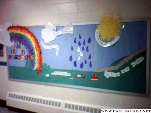 ![]() The board is made strictly of colored butcher paper and construction paper. Any writing was done with markers. I placed sky blue butcher paper on the top 3/4 of board. I lined large green construction paper along the bottom to serve as grass and up the hill. The rainbow was constructed by my fourth graders. The sun rays are also hand prints. The rest was just cut out raindrops, shamrocks, road and clouds. I used in the hallway at our school during March, just to brighten things up! The blessing is as follows: "May the road rise up to meet you, may the sun shine on your face, may the wind always be at your back, and may the rain fall softly on your fields, and until we meet again may God hold you in the palm of His hand." Each picture is labeled with the part of the blessing that pertains to it. (e.g. the sun has under it, may the sun shine on your face) At the bottom are random colored pieces. I let the kids type school blessings on our handhelds and stick them up with the Irish blessing. (e.g. May you always do your best. May you always get good grades.)