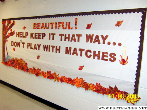 ![]() Beautiful! Help Keep It That Way, Don't Play With Matches! The four year old child development class sponge painted the leaves red, orange, yellow, and brown. The exclamation point at the end of the caption is a lit match.