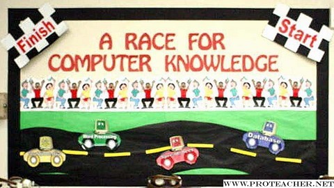![]() I used this bulletin board to teach the children about the basic programs that are available to them. To make the board I used plain butcher paper for the background. I added a string of people I printed with Publisher for the audience and made a START and FINISH checkered flags for each corner. Then using Clipart in Publisher I placed a computer on top of a race car and just changed the color to have four different cars. On the side of each car I used the words, Database, Spreadsheet, Word Processing, and Multimedia. I then placed them on the "race track". I finished off with die-cut letters spelling "RACING FOR COMPUTER KNOWLEDGE"
