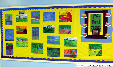 ![]() This Bulletin Board showcases the Spring Season in Monet's visionary paintings of his garden and fields. The lesson included studying Monet and his love of nature and color in order to better copy his style and techniques. (The first graders were shocked and excited to hear that he was one of the first artists to paint outside!) They also learned how different his style was compared with that which was popular at the time. After examining various paintings by Monet in order to see how he used brush strokes and thick paint, the children used pencils to sketch the main shapes and forms. They used oil pastels to layer color while blending and mixing to mimic the effects made with brush strokes. As we worked, the class continued the discussion about seasons and how the sunlight is stronger and appears differently as the seasons change. We spoke about how light reflects on water, ice and snow and how it appears to warm the ground in the spring season. We discussed how Monet's use of reds, oranges and yellows invoke this sense of warmth. The students worked diligently to recreate the thick appearance of Monet's paint and his use of light and reflections. They did a tremendous job evoking the seasonal characteristics of spring by using various shades of green for the foliage and vibrant colors for the flowers. They duplicated the warm colors Monet used to show a rising or setting sun and the reflection of that light on the ground and water. They captured the essence of Monet's passion for nature by experimenting with colors and mixing them to achieve as close a rendering as possible. The Bulletin Board reflects their understanding of Monet's genius while clearly reflecting their own efforts and abilities to mimic and interpret.