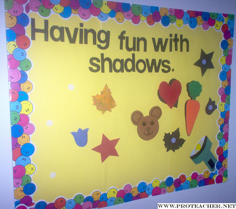 ![]() This board was one of the boards I used during the month of February to go along with the Groundhog's Day activities. I used a store-bought border and yellow construction paper for the background. I used die-cut letter for the title. This board gave the children the opportunity to enhance their visual discrimination and fine motor skills. The object was to match the different items with their "shadows." I made some of the items and some were die-cut, and I made the flashlight in the lower corner. The pieces should be laminated to last longer, considering this board is a game for the children and the pieces are manipulated frequently. I used Velcro dots on the board and on the items. This allowed the children to move the pieces from side to side. The children had lots of fun matching the pieces!
