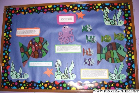 ![]() Rainbow Fish, by Marcus Pfister is a wonderful book about friendship and sharing. I used this book to teach my class about these qualities. Each child made their own rainbow fish with one shiny scale to illustrate the end of the book when Rainbow Fish gives away his scales. The story says he will no longer be the most beautiful fish in the ocean, but he will have friends, which is so much more important. Alongside the artwork are excerpts from the book which help tell the story of the Rainbow Fish. Children can look at the board and "read" along with it.