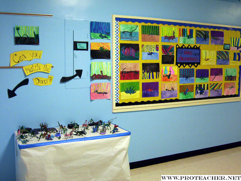![]() The Bulletin Board I selected showcases a First Grade project I taught which included making a three dimensional dinosaur from found wood and subsequently drawing the sculpture. The initial challenge for the students was to make a creation that resembled a dinosaur and could also rest on its legs. Each child was given the same amount of wood, although the pieces varied slightly in size and shape, and were then directed to assemble and reassemble the pieces until they determined how to keep their dinosaurs stationary. It was a process of trial by error as they improved their original designs to meet this goal. The children then painted their dinosaurs a single, unique color by mixing paint. They then mixed a secondary, complimentary color to create a pattern, much like a camouflaged skin or hide. They also painted eyes on the head of the creature to further demonstrate the clarity of their design. The second part of the project was to draw a still life of their dinosaurs. As a result of their familiarity with the construction and how the pieces interlocked (much like bones), they were capable of drawing with ease and accuracy. To complete the drawing the students created a background comprised of simple patterns and used a single lighter or darker watercolor for the foreground to contrast with the background. When completed, I situated the 2-D work next to the 3-D work and placed a sign alongside which asked the viewers to "Find the Matching Dino" (as seen in the digital photo). This Bulletin Board provided the first grade with the ability to see their work as an exhibit, as well as providing the school with an interactive exhibition for all who walked by. It became an engaging source of artwork that was both informative and entertaining.