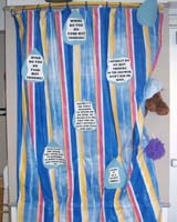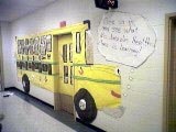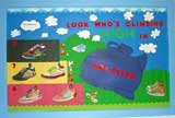 bulletin board help By: Julianne Wow, I'd hate it if someone told me what themes to use on my boards! But you need some help right away and THEN go on to fight that battle. So here are a couple of tried and true ways to fill the two hall boards. (What age group are we talking about here?) Fall: 1. Give each student a piece of paper and have them do a quick watercolor wash in fall colors. When they have dried cut leaves from the papers. You can have older students do it themselves, have an aide or yourself do it for younger students. Then cut a quick tree trunk or two from brown paper and put the thing up. Caption: Fall Colors from Room ___. These are good because the watercolor papers tend to curl, giving the leaves a 3D appearance. 2. Make apple prints with red, yellow and green paint. Cut frames from red or green construction paper and have each student sign their work. Caption: Fall Harvest from Room ___. All About Me: 1. Have each student draw a life-sized head and shoulders of themselves. Now interview each student (a parent volunteer job if possible) and write on a 3X5 index card the answers to three simple questions - My favorite food is _________, I have _____ brothers and sisters, You can decide what you want to ask based on the ages of your students. Attach the finished card to the bottom of the portrait at the top edge only. Under the card write the child's name. Post the pictures on the board so that students can look at the portrait, read the questions, and guess who the picture is. They can lift the card to see if they are right. Caption: Who Am I? (Hint: I'm in Room _____.) 2. Use the back of a paper plate for a face. Have students create a self portrait using yarn, buttons, sequins, glitter, paint, etc. Cut a torso from construction paper and let students write a short piece of information about themselves on the torso - My name is Fred. I like eating pizza. My best friend is Tommy. I went to Disneyworld this summer. Caption: The Faces in Room _____.