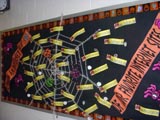 Spiders Bulletin Board By: Rosemary Last year I bought the fake cobwebs (I think I paid about $1.99 at CVS. I then gave each child two pieces of black construction paper and an index card. They traced a circle that was about 7" (I had them trace an empty caramel corn container). I use them to hold pencils, rulers, etc. Then they cut the second sheet of paper into eight equal strips and folded them accordion style to make spider legs. WE listed Halloween words on the board (cat, bat, scary, hairy etc.) and wrote two line rhyming poems called creepy couplets. It was very cute.