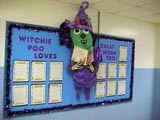 Halloween bulletin board By: Gail Howell I taught first grade for five years, and have been teaching for awhile. I would recommend to skip a Halloween bb, and make a fall one (It will last longer, and save work for you.) When you're a beginning teacher, especially in first grade, you need all the extra time you can possibly get, preparing for lessons, and should make your life as stress free as possible. "We have fallen into reading".....Students draw a picture on a leaf, and write about what they like about their favorite book or favorite book character. The best advice ever given to me was...Make it simple and make it the students' work. All you need to do put up the border & banner...and then the rest is up to the students.
