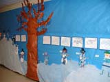 Winter Bulletin Board By: Tricia I live in a NY where we get a lot of snow and winter lasts forever! I do a winter bulletin board, which can stay up until April! The background is light blue. I use fiber fill (pillow stuffing) to make rolling hills of snow. I usually cut out snowmen with a die cut and have the students make snowflakes. The kids last year chose the title -"All flakes welcome!" This year my students are making a 3-D snow globe with snowmen and snowflakes. Some students thought of title. This year they chose "Frosted Flakes". Another idea I have used is large mittens and hats made out of construction paper. Students can write a poem about winter on the hat or mitten. The title could be "Bundle up with care".
